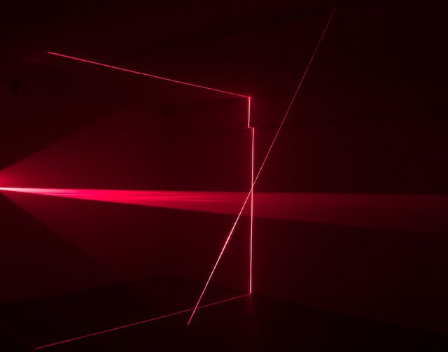 Plum kreiert hier einen Lichtraum, indem er Nylonschnüre spannt, an denen sich das Laserlicht bricht und entlang wandert. So entsteht ein temporär erfahrbarer Raum aus Lichtkanten, der auf den Betrachter wie ein Kraftfeld wirkt. Verbindende Elemente zwischen den verschiedenen Darstellungsformen von raumgeifender Laserinstallation, Fotografie und Zeichnung sind die Betonung der zeichnerischen Linie, der Ausdruck von Energie und die Suche nach Raum.